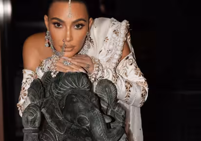 Kim Kardashian shared a couple photographs of the diamonds and pearls she wore to Anant Ambani and Radhika Merchant’s wedding. She wore a stunning ivory and gold lehenga by Manish Malhotra. She was wearing a big diamond necklace, earrings, and a mang teekha. She also showed off a lengthy, diamond-studded nose ring. In one of the photos, however, she posed with a Ganesha idol. Many people were not pleased because she utilised a Ganesha idol as a prop.